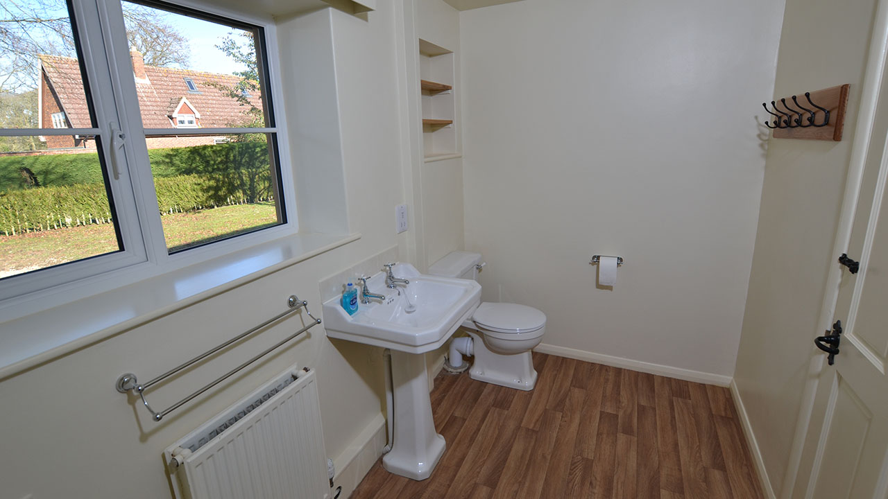 Boiler Room: 1.6 x 1.6m Vinyl floor, central heating boiler, toilet, wash basin.