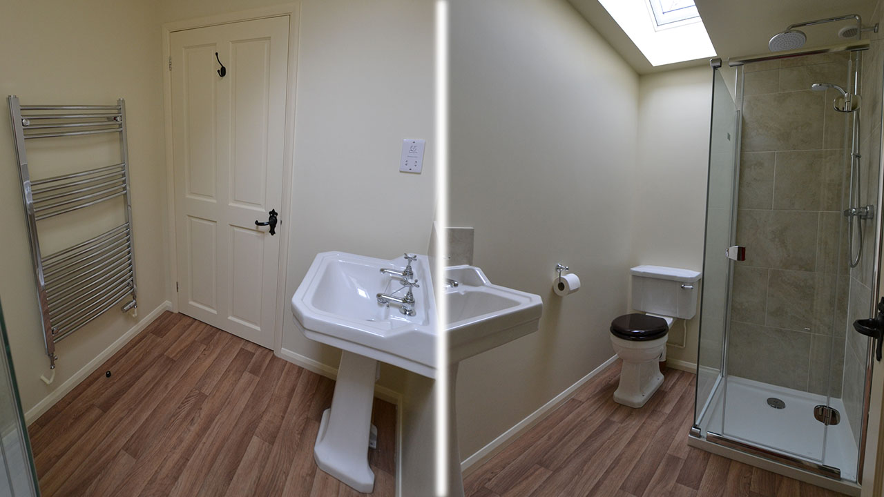 Shower Room: 1.6 x 2.15m Vinyl floor, heated towel rail, wash basin, toilet, dual shower.