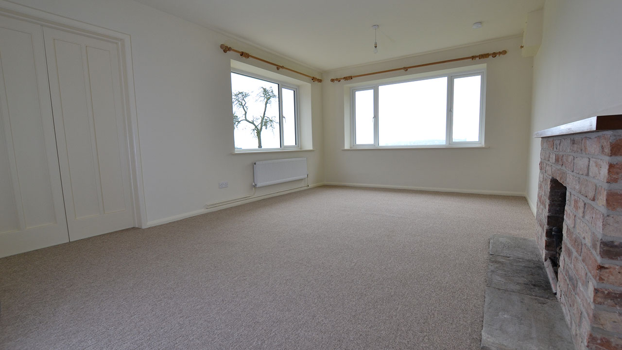 Open plan area with fantastic view. Carpeted floor, 2 radiators, stone fireplace.